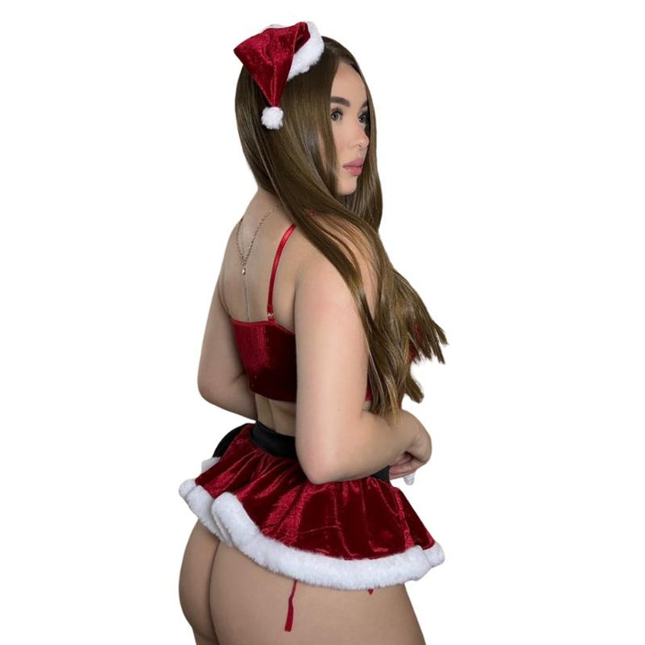Este conjunto incluye un top corto rojo aterciopelado con detalles en peluche blanco y delicados bordes dorados, que resalta la figura y aporta un toque festivo irresistible. La parte inferior está compuesta por una falda corta en terciopelo rojo con borde de peluche, cinturilla negra y un adorno decorativo tipo hebilla que añade un toque coqueto y elegante y tanga.